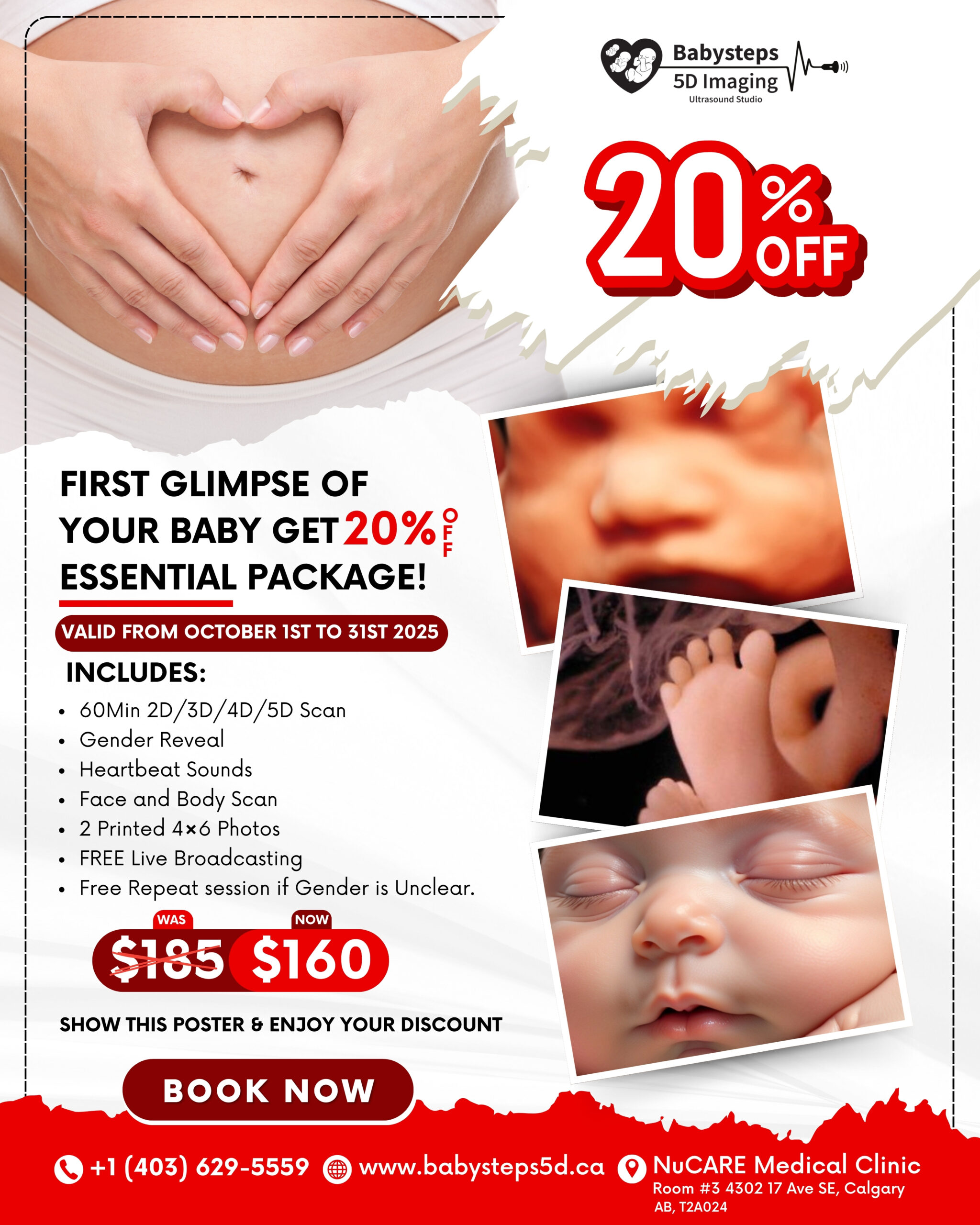 Baby Steps 5D Clinic offers an affordable ultrasound in Calgary with a 60-minute session. Includes gender reveal, baby photos, heartbeat sounds, and free repeat session if needed. Special October discount – book now!